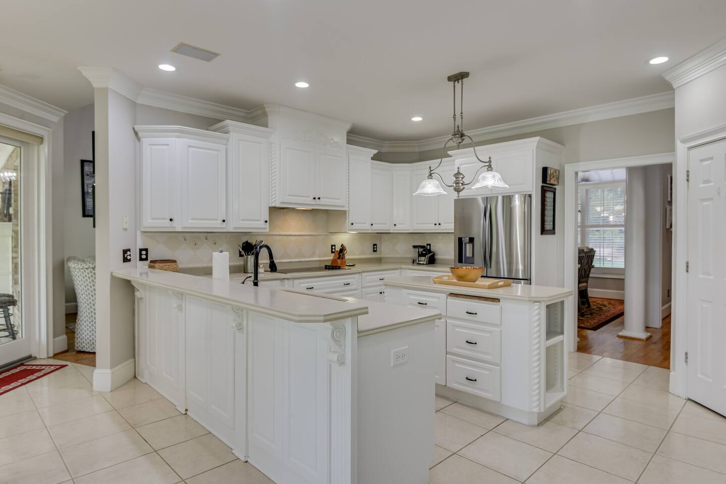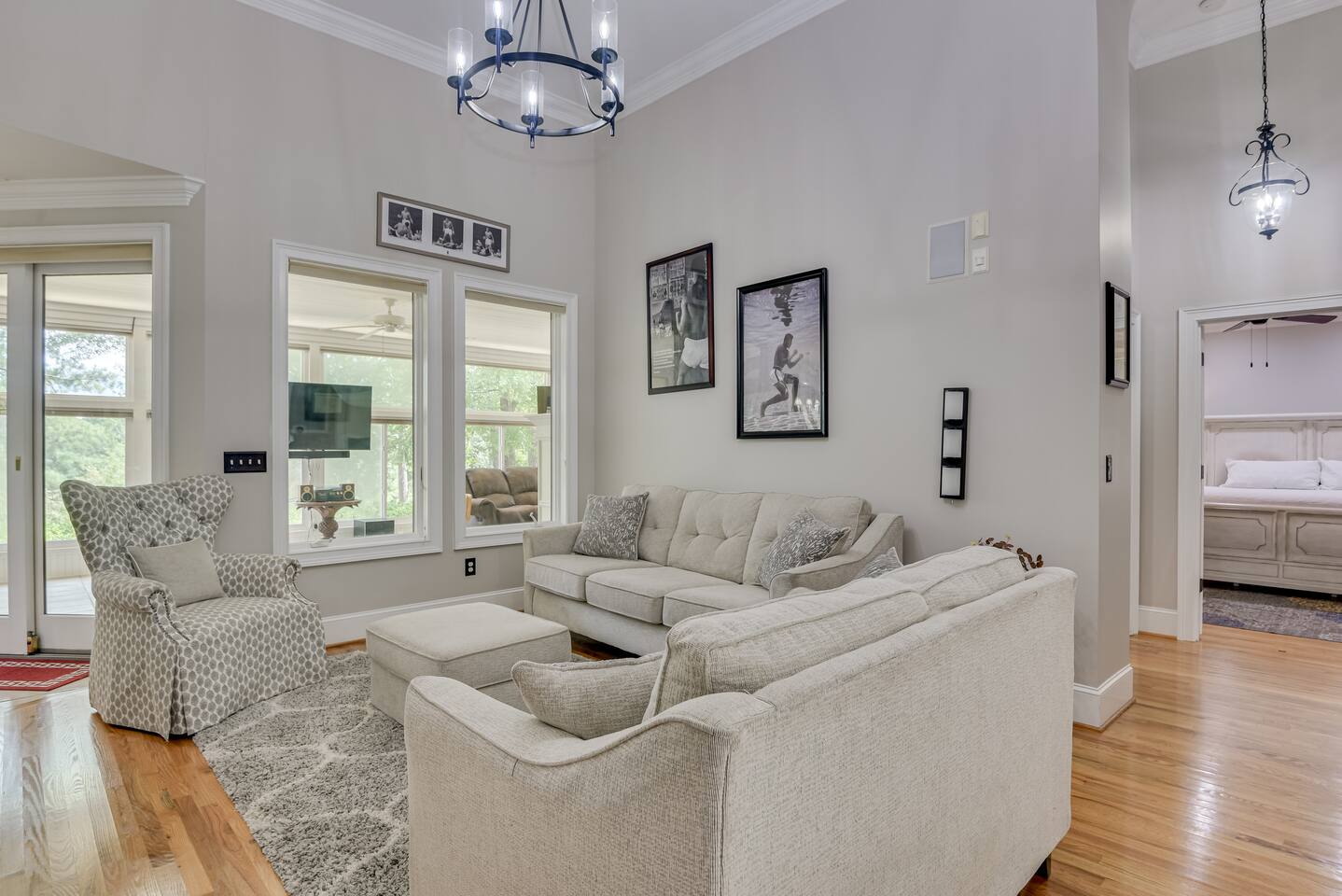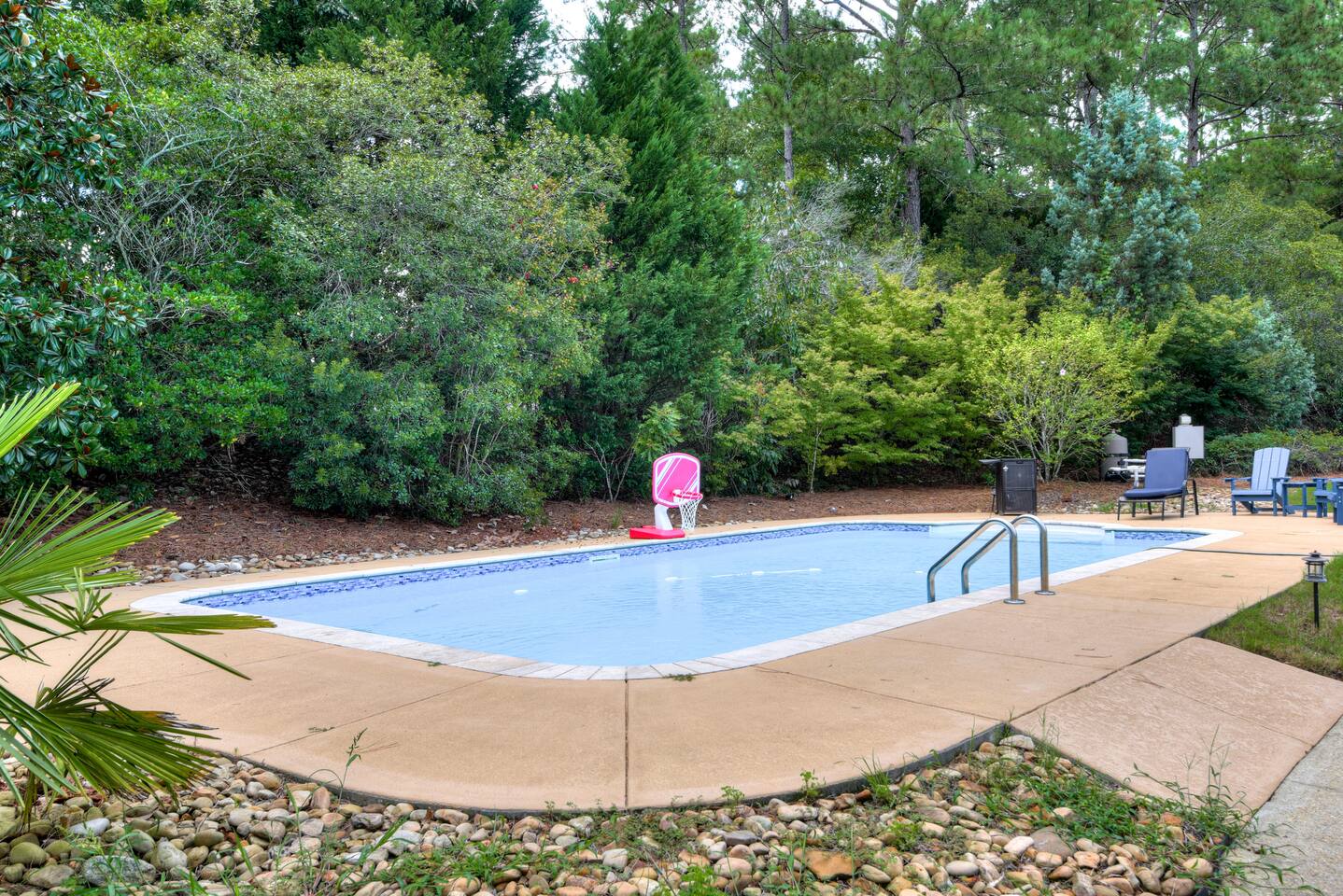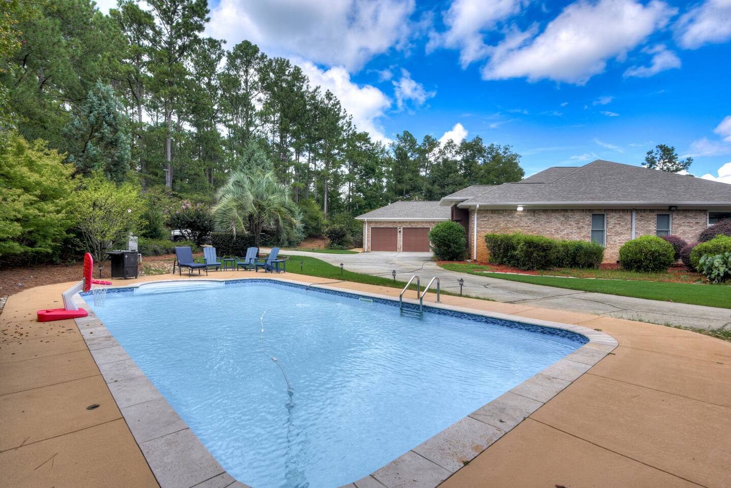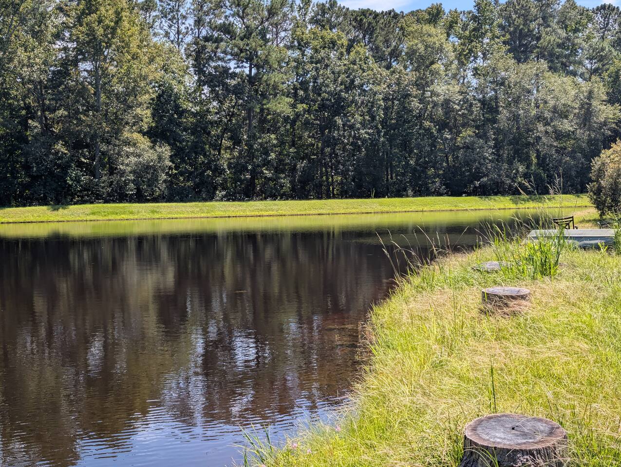 Perfect for small gatherings or quiet getaways! Book now to make memories that will last a lifetime :) Indoors -Single story home with all areas on the ground floor only 2 smalls steps at the front entrance. -Bedroom 1: King bed, dresser, TV, and ensuite bathroom. Luxurious walk-in shower and soaking tub. -Bedroom 2: Queen bed, dresser, TV -Bedroom 3: Queen bed, dresser, TV -Bedroom 4: Queen bed, dresser, TV -Hall bathrooms (2): One with tub, one with walk-in shower -Kitchen: Stainless steel appliances, kitchen island -Dining Room: Seats 6 -Dining Room 2: Seats 4 -Living Room: Sofa, loveseat, and TV -Living Room 2: Sofa, loveseat, and chair -Sunroom: Workspace, Sofa, Peloton, and TV Outdoors -Private pool for relaxation (the pool is NOT heated). -Outdoor kitchen for entertaining, includes top grate gas grill, flap top grill and two burners as well as an outdoor beverage refrigerator and ice maker! -One large stocked lake for fishing located just behind the house about a 5 minute walk. (Please note: small two ponds are not open for fishing.) -Parking in the driveway for up to 8 vehicles