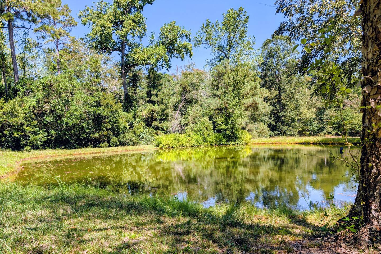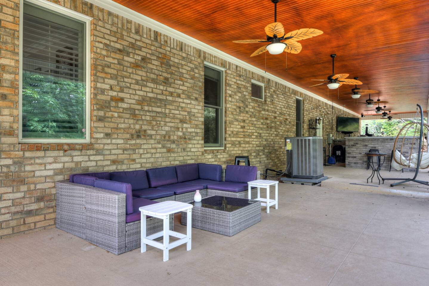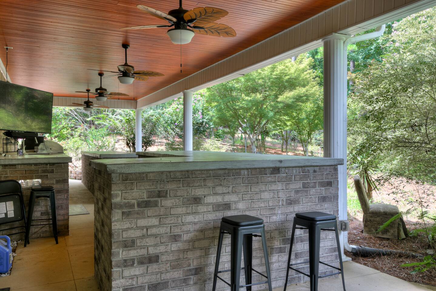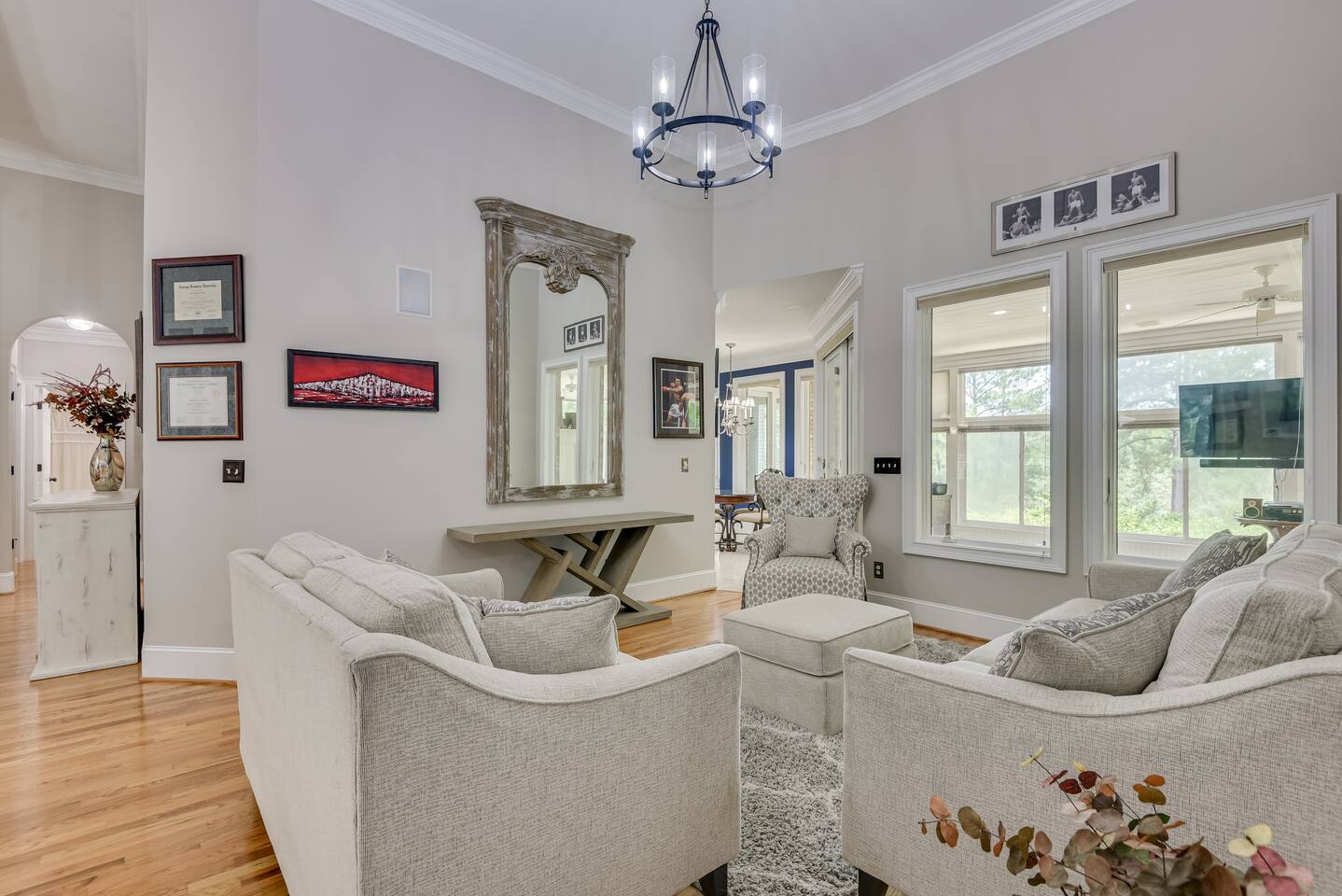 Perfect for small gatherings or quiet getaways! Book now to make memories that will last a lifetime :) Indoors -Single story home with all areas on the ground floor only 2 smalls steps at the front entrance. -Bedroom 1: King bed, dresser, TV, and ensuite bathroom. Luxurious walk-in shower and soaking tub. -Bedroom 2: Queen bed, dresser, TV -Bedroom 3: Queen bed, dresser, TV -Bedroom 4: Queen bed, dresser, TV -Hall bathrooms (2): One with tub, one with walk-in shower -Kitchen: Stainless steel appliances, kitchen island -Dining Room: Seats 6 -Dining Room 2: Seats 4 -Living Room: Sofa, loveseat, and TV -Living Room 2: Sofa, loveseat, and chair -Sunroom: Workspace, Sofa, Peloton, and TV Outdoors -Private pool for relaxation (the pool is NOT heated). -Outdoor kitchen for entertaining, includes top grate gas grill, flap top grill and two burners as well as an outdoor beverage refrigerator and ice maker! -One large stocked lake for fishing located just behind the house about a 5 minute walk. (Please note: small two ponds are not open for fishing.) -Parking in the driveway for up to 8 vehicles