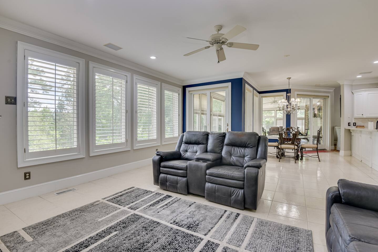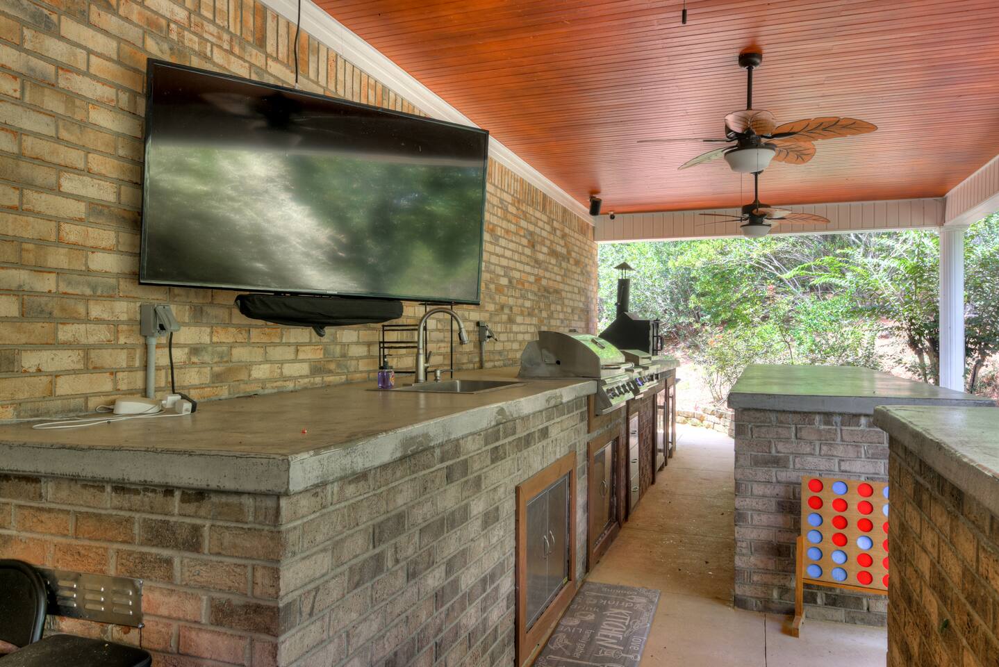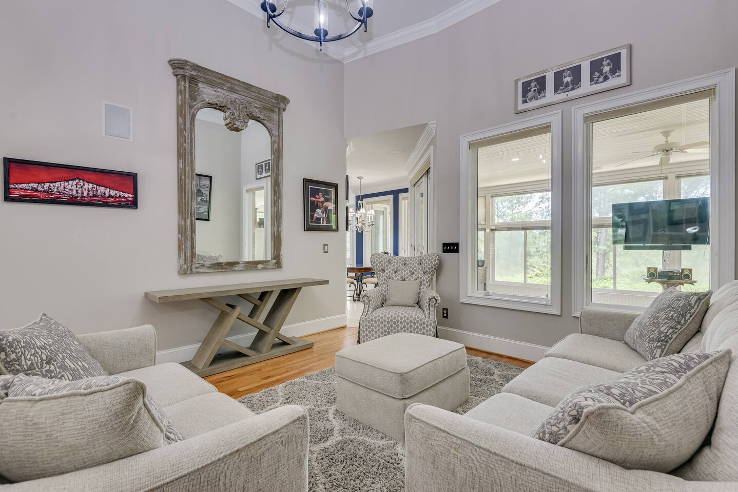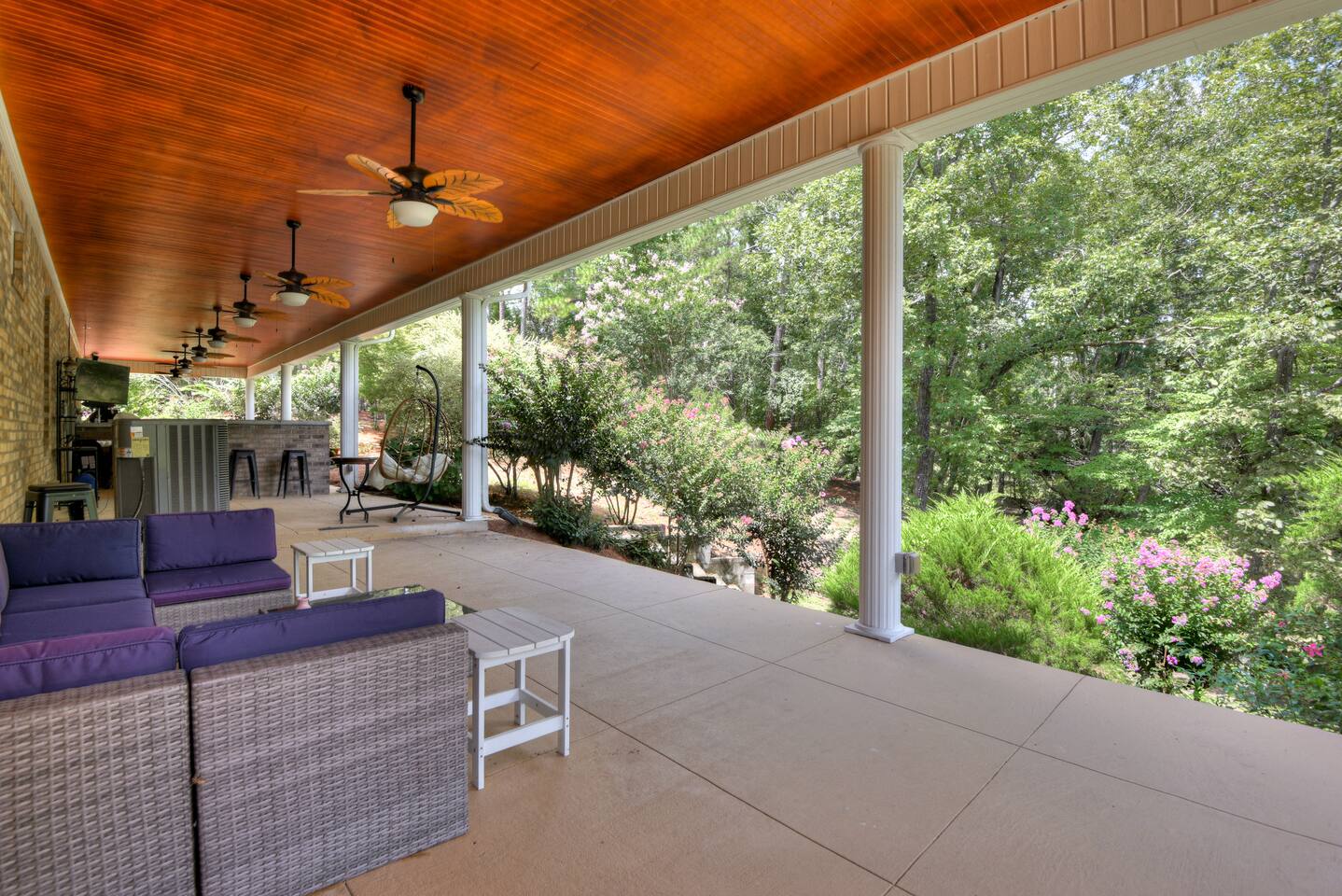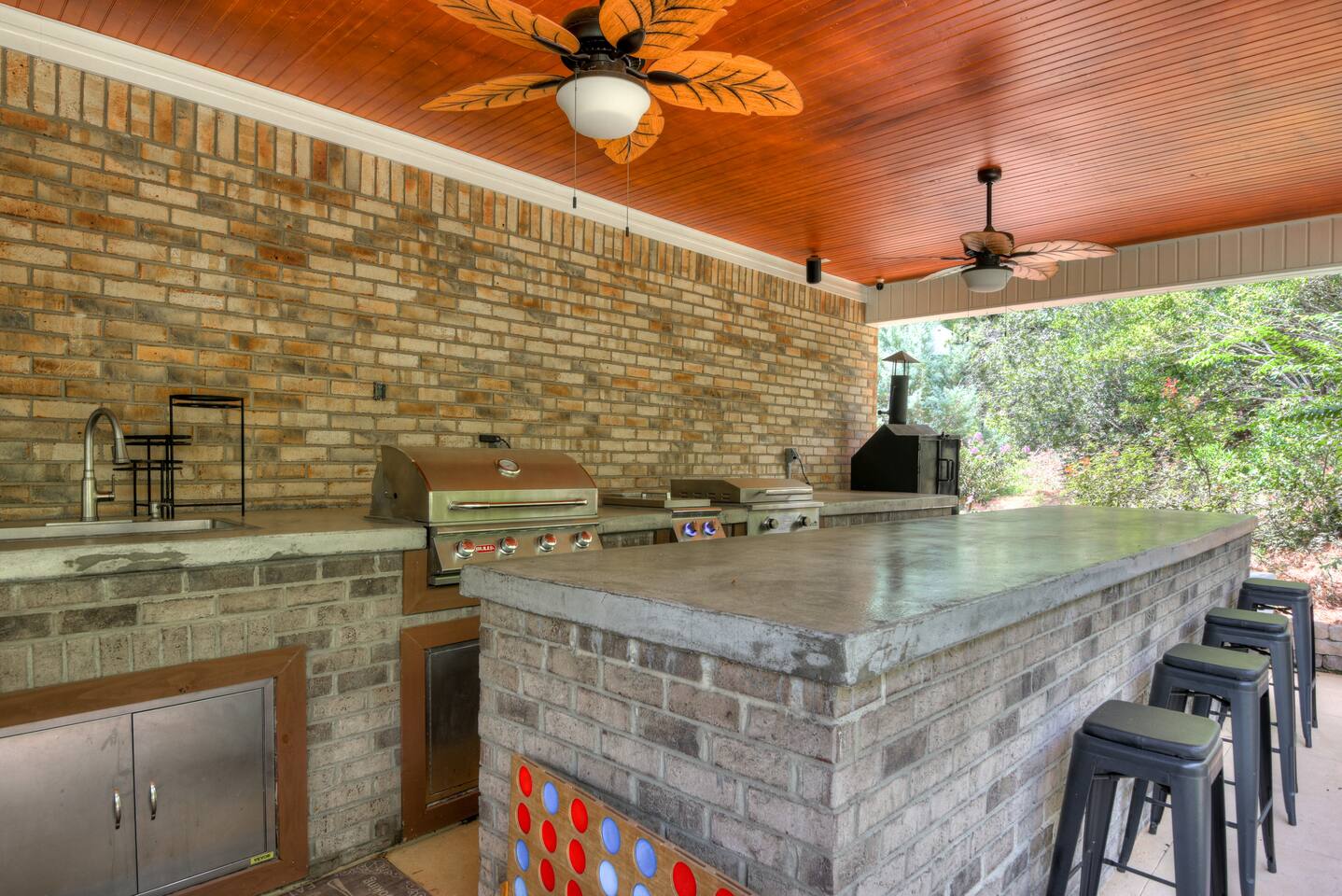 Perfect for small gatherings or quiet getaways! Book now to make memories that will last a lifetime :) Indoors -Single story home with all areas on the ground floor only 2 smalls steps at the front entrance. -Bedroom 1: King bed, dresser, TV, and ensuite bathroom. Luxurious walk-in shower and soaking tub. -Bedroom 2: Queen bed, dresser, TV -Bedroom 3: Queen bed, dresser, TV -Bedroom 4: Queen bed, dresser, TV -Hall bathrooms (2): One with tub, one with walk-in shower -Kitchen: Stainless steel appliances, kitchen island -Dining Room: Seats 6 -Dining Room 2: Seats 4 -Living Room: Sofa, loveseat, and TV -Living Room 2: Sofa, loveseat, and chair -Sunroom: Workspace, Sofa, Peloton, and TV Outdoors -Private pool for relaxation (the pool is NOT heated). -Outdoor kitchen for entertaining, includes top grate gas grill, flap top grill and two burners as well as an outdoor beverage refrigerator and ice maker! -One large stocked lake for fishing located just behind the house about a 5 minute walk. (Please note: small two ponds are not open for fishing.) -Parking in the driveway for up to 8 vehicles