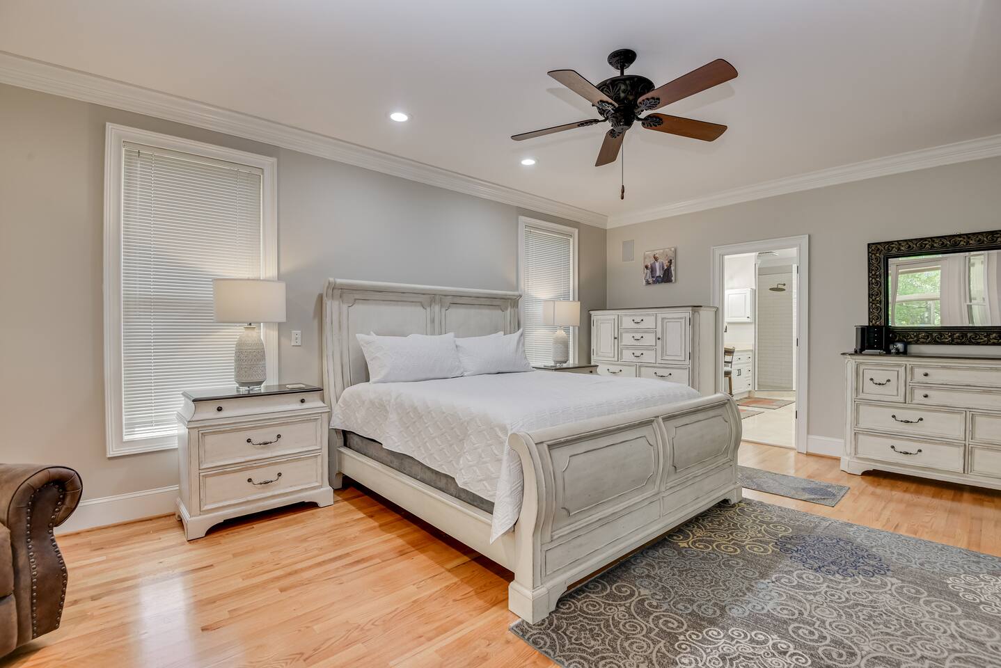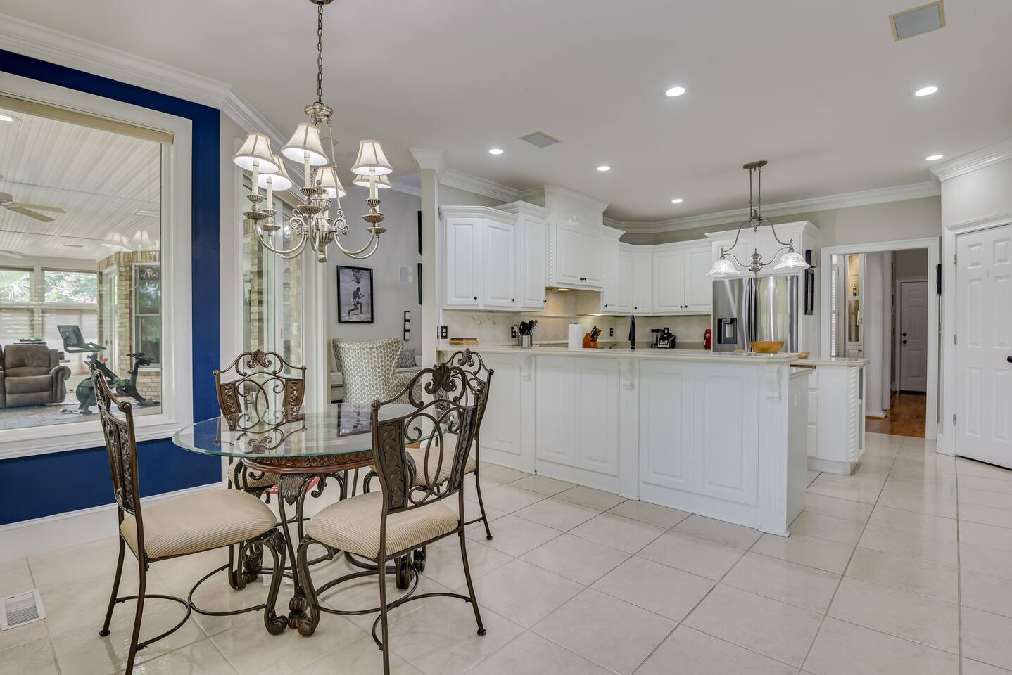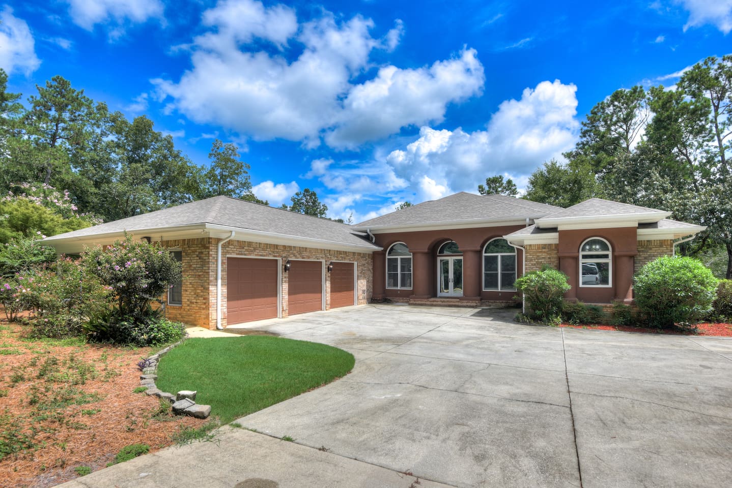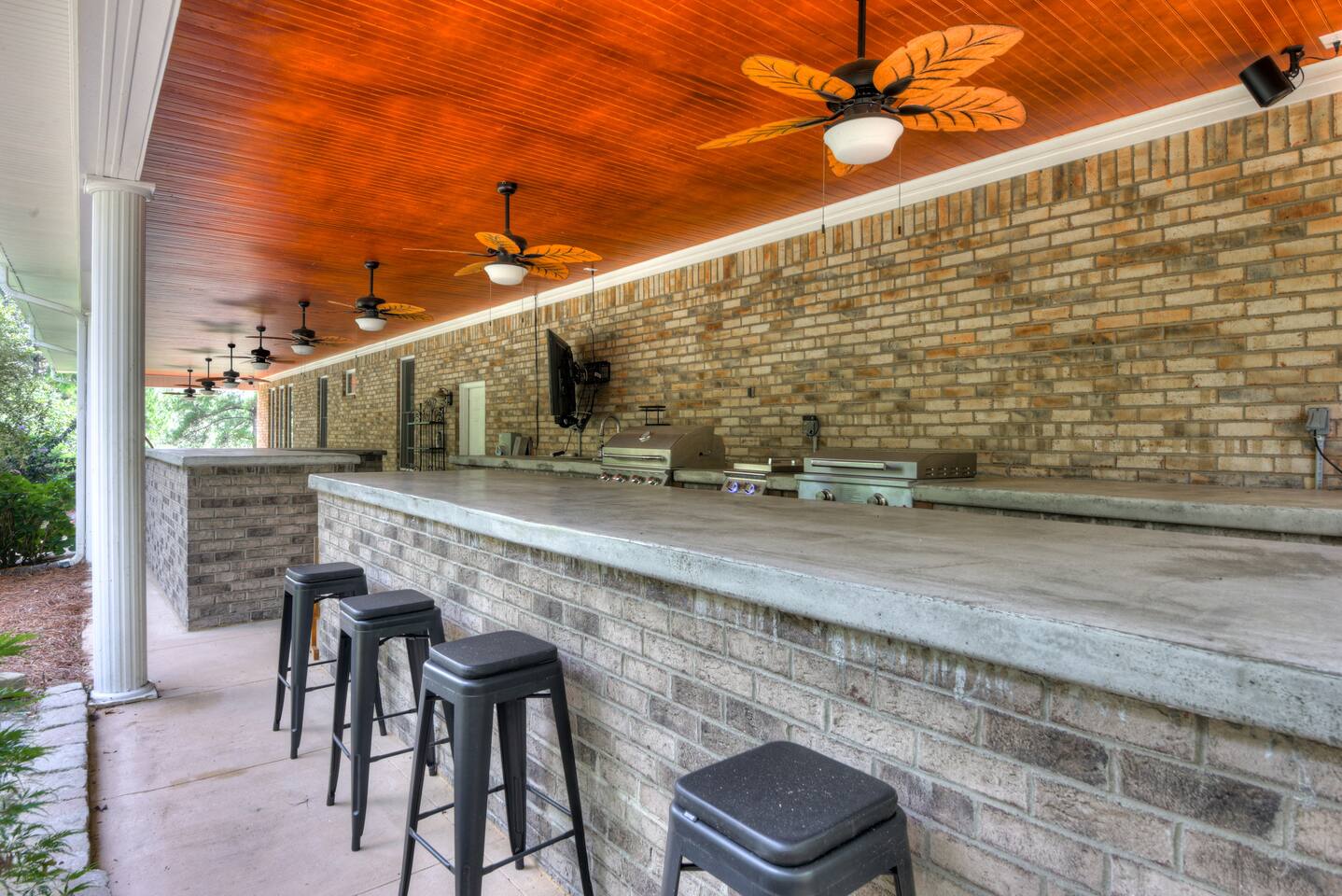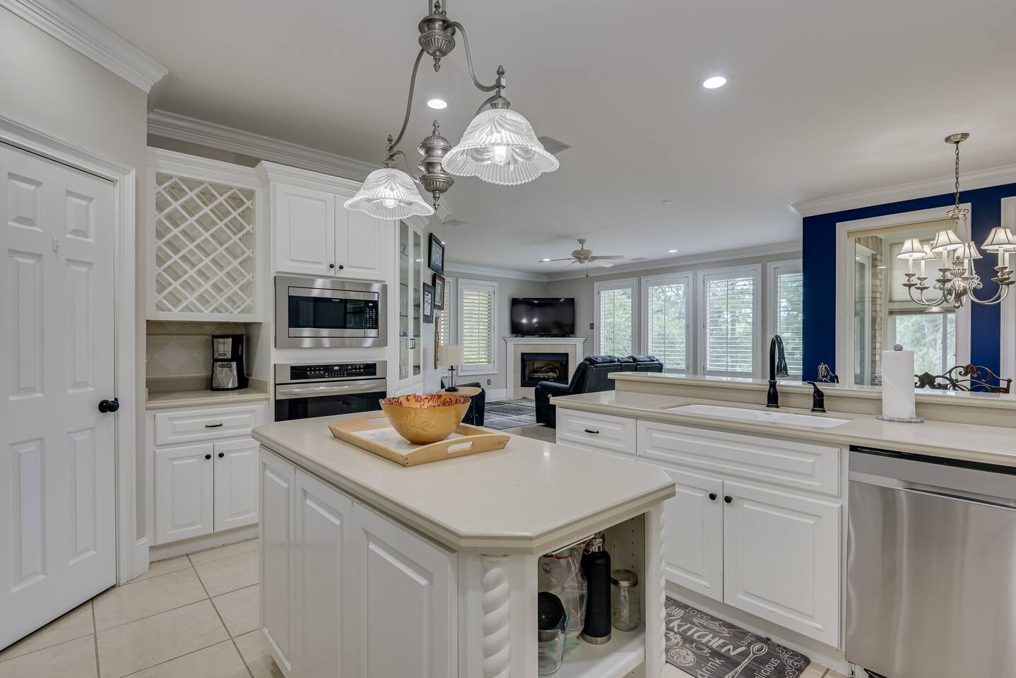 Perfect for small gatherings or quiet getaways! Book now to make memories that will last a lifetime :) Indoors -Single story home with all areas on the ground floor only 2 smalls steps at the front entrance. -Bedroom 1: King bed, dresser, TV, and ensuite bathroom. Luxurious walk-in shower and soaking tub. -Bedroom 2: Queen bed, dresser, TV -Bedroom 3: Queen bed, dresser, TV -Bedroom 4: Queen bed, dresser, TV -Hall bathrooms (2): One with tub, one with walk-in shower -Kitchen: Stainless steel appliances, kitchen island -Dining Room: Seats 6 -Dining Room 2: Seats 4 -Living Room: Sofa, loveseat, and TV -Living Room 2: Sofa, loveseat, and chair -Sunroom: Workspace, Sofa, Peloton, and TV Outdoors -Private pool for relaxation (the pool is NOT heated). -Outdoor kitchen for entertaining, includes top grate gas grill, flap top grill and two burners as well as an outdoor beverage refrigerator and ice maker! -One large stocked lake for fishing located just behind the house about a 5 minute walk. (Please note: small two ponds are not open for fishing.) -Parking in the driveway for up to 8 vehicles